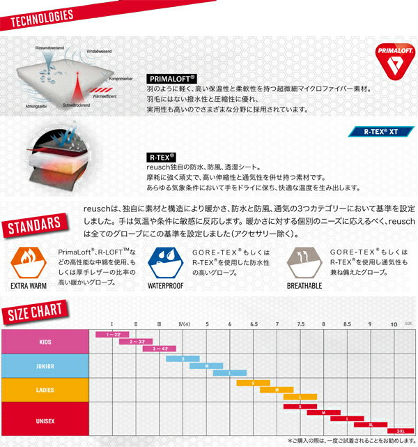 REUSCH ロイシュ ジュニア スキーグローブ ■TILLY R-TEX XT JR. カラー ・700 ブラック ・100 ホワイト ・340 パウダーピンク Features ・PRIMALOFT ・R-TEX XT ・レギュラーカフ ・リストバンド EXTRA WARM PrimaLoft、R-LOFTなどの高性能な中綿を使用、もしくは厚手レザーの比率の高い暖かいグローブ。